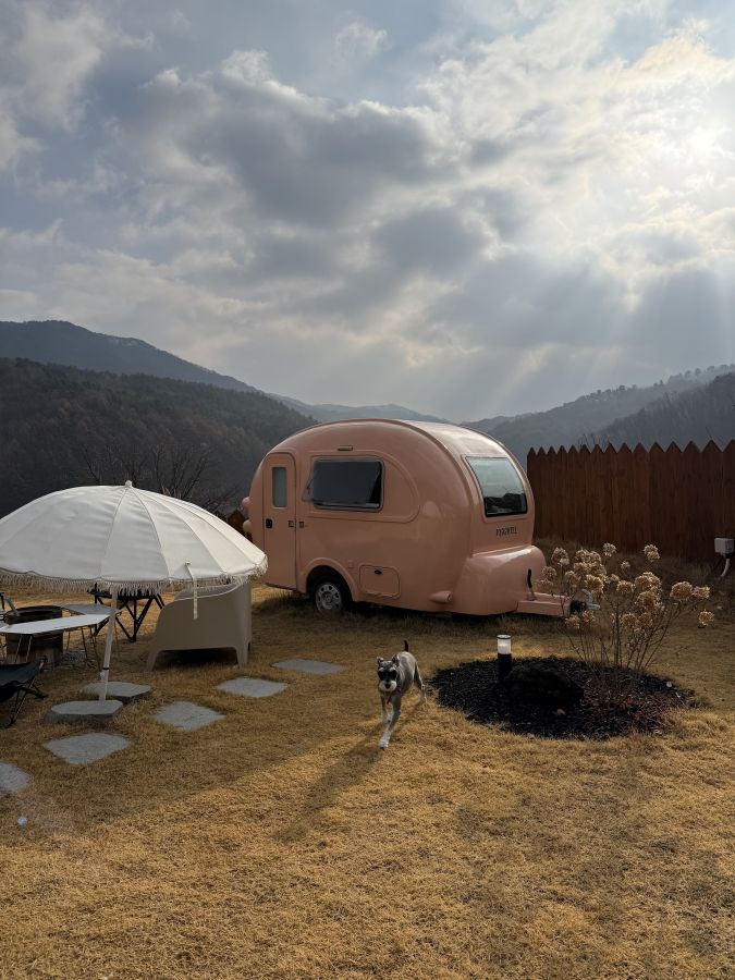 외부에는 천연 잔디마당에 불멍이 가능한 파이어피트와 캠핑카가 구비되어 있으며,