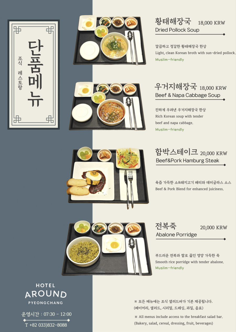 ※ 당일 조식뷔폐 인원 50인이하 또는 식당 사정에 따라 조식메뉴 <단품메뉴+샐러드바>로 변경될수 있으니 양해바랍니다.