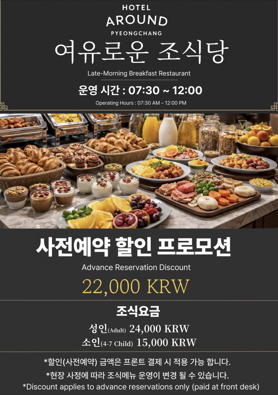 * 위치 : 호텔동 L층 "라포레 레스토랑" 07:30 ~ 12:00까지 운영. (라스트오더 11:20까지)